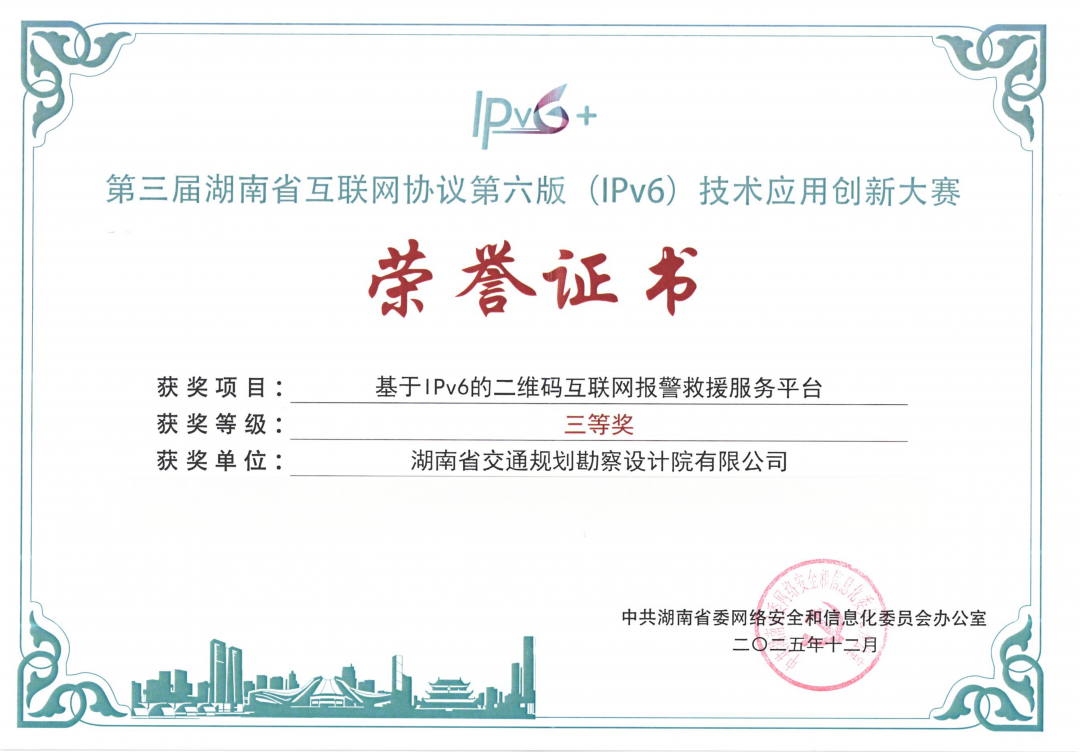近日,第三届湖南省IPv6技术应用创新大赛颁奖仪式在长沙举行。大赛由省委网信办主办,旨在挖掘IPv6技术应用创新成果,推动其在重点领域深度应用。湖南交通设计院牵头申报的“基于IPv6的二维码互联