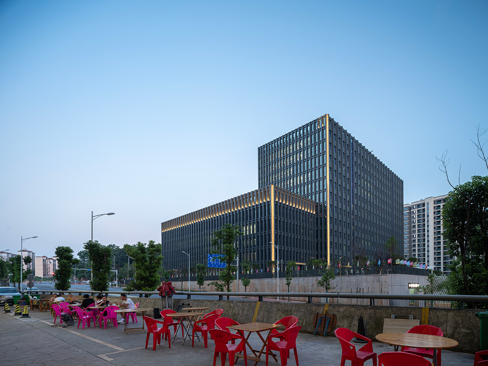 办公楼的设计强调规划地块的整体性,在建筑设计、道路交通、绿地景观方面进行衔接和统一,形成一个建筑美观、道路通畅、景观和谐的办公园区。同时将公园景观资源最大化,并形成空间关系良好,天际线优美的建筑体量。“借外景,塑内景”,规划采用借景、对景、渗透、造景等手法,营造优美宁静的办公氛围,使每个办公均拥有绝佳的视觉景观。 综合运用点线面体等造型元素,形成有节奏的韵律感,大面积玻璃幕墙则采用明快通透的分割形式,与周边环境互相渗透。